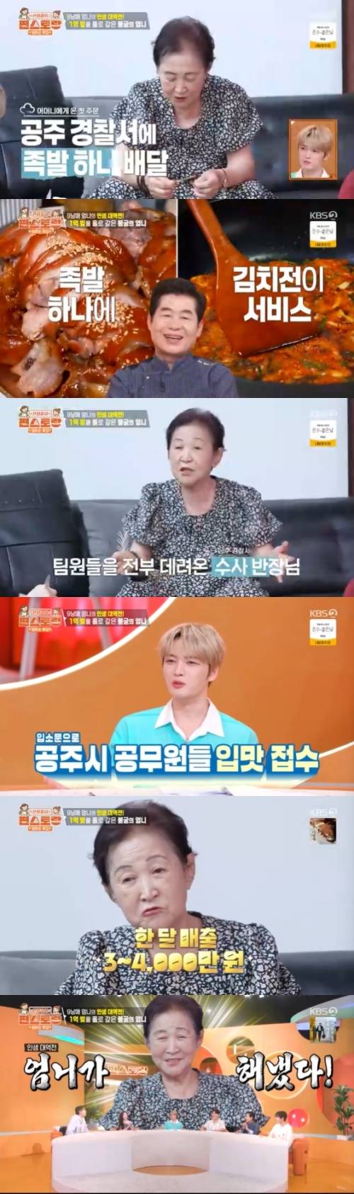 김재중 어머니는 "식당에 파리만 날리다가 경찰서에서 족발 배달 주문이 들어왔고, 서비스로 김치전을 만들어줬는데, 그 다음 날부터 수사 반장님이 팀원들을 전부 데려왔다"며 맛집으로 입소문이 나면서 공주시 공무원들의 맛집으로 자리매김했다고 설명했다.