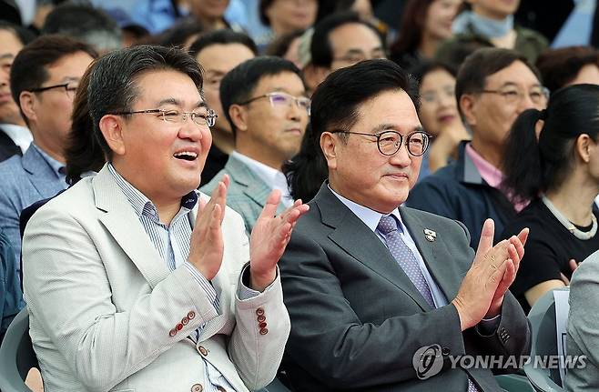 (서울=연합뉴스) 우원식 국회의장과 오승록 노원구청장이 19일 서울 중계구민체육센터 신축 착공식에서 박수를 치고 있다. 2025.9.19 [노원구청. 재판매 및 DB 금지]