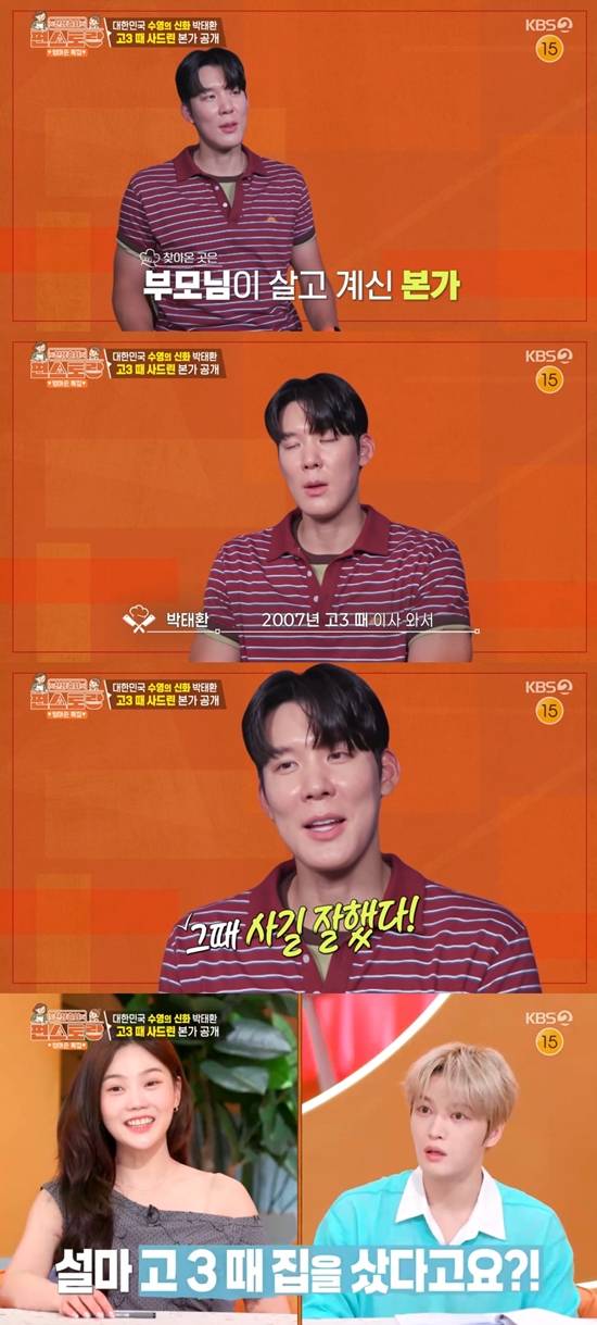 이날 방송에서 박태환은 "여기는 부모님 계신 본가다. 27년에 고3 때부터 같이 살던 본가다. 이 집 오면 옛날 생각이 많이 나서 좋다"라며 본가를 소개했다. 이어 그는 "그때 사길 잘했다. 부모님 집은 제가 해드렸다"라고 고백했다.