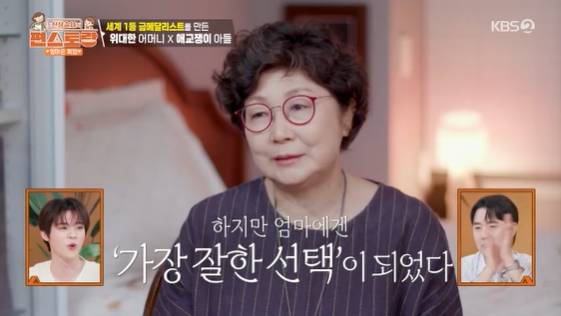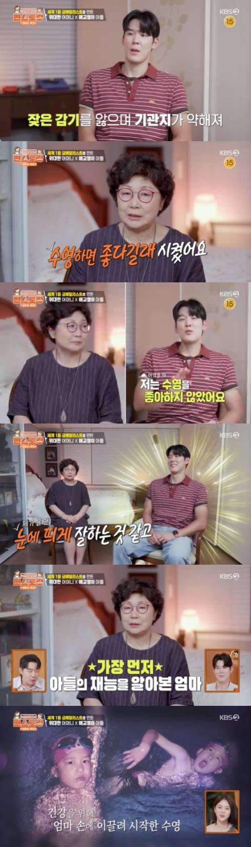 어머니는 "수영하니까 눈에 띄게 하는 거 같고, 그래서 수영 한번 시켜보자 했는데, 그래도 꼬맹이 때니까 알게모르게 윽박지르면서 끌고 다녔다"며 "생각해보면 지금까지 한 선택 중에 제일 잘한 선택"이라고 했다. 붐은 "어머니가 진짜 제일 대단하다"며 엄지를 치켜세웠다.