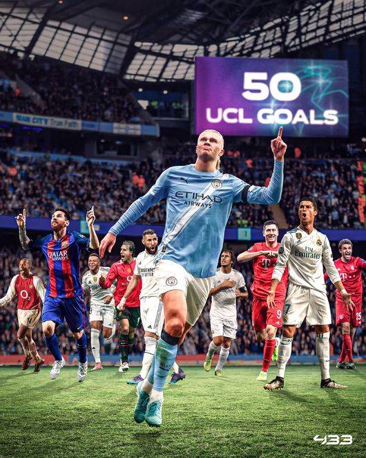 맨시티는 "홀란은 50골을 넣기까지 112경기가 걸렸던 앙리와 동률을 이루고 있다. 경기당 1골 이상을 기록 중인 그의 기록은 역대 득점 순위 50위 이내에 있는 그 어떤 선수들보다 훨씬 뛰어나다. 홀란은 UCL에서 맨시티 소속으로 27골, 도르트문트에서 15골, 잘츠부르크에서 8골을 기록했다"라고 전했다.