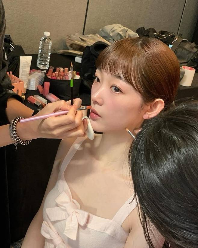 파스텔 톤 드레스와 귀여운 땋은 머리 스타일은 그녀의 상큼한 매력을 극대화한다. 수줍은 듯 하면서도 발랄한 표정은 무대 뒤의 짧은 순간조차도 화보의 한 컷처럼 완성했다.