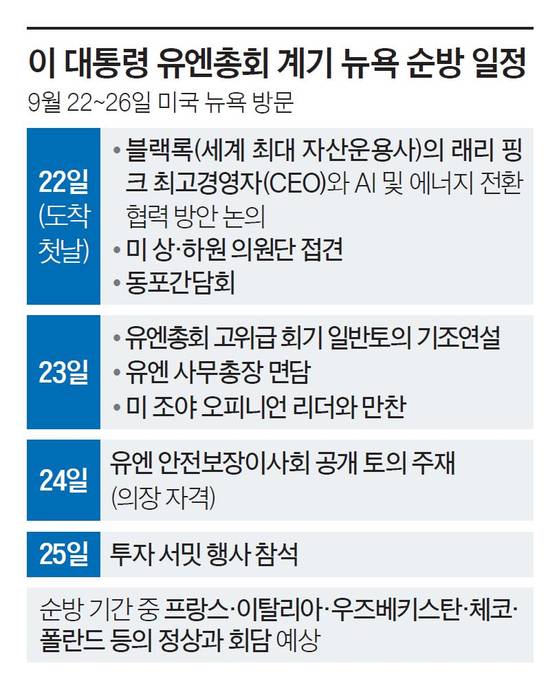 한편 이 대통령은 23일 유엔총회에서 기조연설을 한다. 190여개 국가 정상 중 7번째 차례다. 위 실장은 “기조연설을 통해 민주 대한민국의 복귀를 선언하고 한반도 정책 등 우리 정부의 외교 비전을 제시할 것”이라고 했다. 이 대통령은 24일 오후 3시엔 안보리 공개 토의를 주재한다. 위 실장은 “한국 대통령으로는 최초”라고 말했다. 9월 한 달 동안 한국이 안보리 의장국을 맡고 있기 때문인데, 의장국은 안보리 이사국이 한 달씩 순환하면서 맡는다. 이 대통령은 ‘모두의 AI’라는 기조 아래 국제 사회의 평화와 번영을 위한 공동 대응을 강조할 예정이다. 25일에는 미국 월스트리트에서 한국경제설명회(IR) 투자 서밋 행사를 한다. 위 실장은 “월스트리트의 거물급 금융인이 많이 참석한다”고 설명했다.