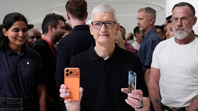 ▲ 애플 CEO 팀 쿡이 지난 9일 캘리포니아주에 위치한 애플 파크에서 열린 신제품 발표회에서 신형 아이폰을 들고 있다.
