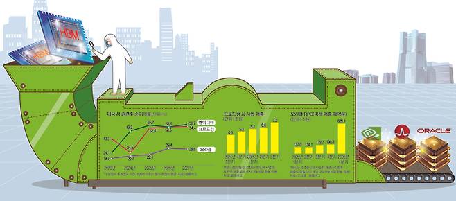 최근 AI 사업에서 두각을 나타내는 엔비디아는 시총 1위이며 브로드컴(7위), 오라클(12위) 모두 상위권이다. K반도체가 코스피를 견인하듯 이들 삼총사도 미 시장의 신고가를 이끌 것이란 전망이다. 월가 관계자는 “헤지펀드들이 미국 AI 관련주를 싹쓸이하고 있다”며 “공격적 투자자라면 고평가 논란에도 더 높은 성장률이 예상되는 이들 주식 비중을 높일 필요가 있다”고 전했다.