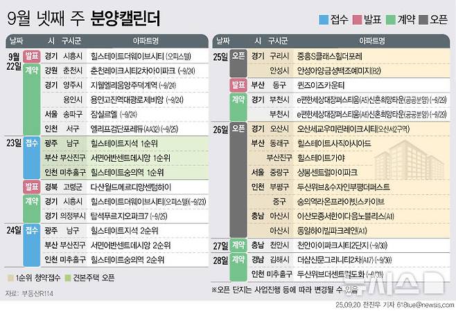 [서울=뉴시스] 부동산R114는 9월 넷째 주 전국 3개 단지 총 2081가구가 분양을 시작한다고 20일 밝혔다. 이중 일반분양은 281가구다. (그래픽=전진우 기자)