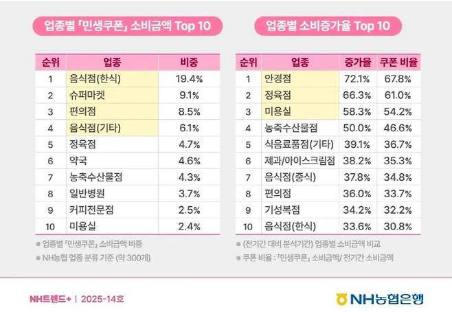 소비쿠폰을 가장 많이 사용한 곳은 한식당이었다. 소비쿠폰 사용금액 비중으로 보면 한식당(19,4%), 슈퍼마켓(9.1%), 편의점(8.5%) 순으로 나타났다. 정육점(4.7%)과 약국(4.6%)이 각각 5~6위, 미용실이 2.4%로 소비금액 상위 10개 업종에 이름을 올렸다.
