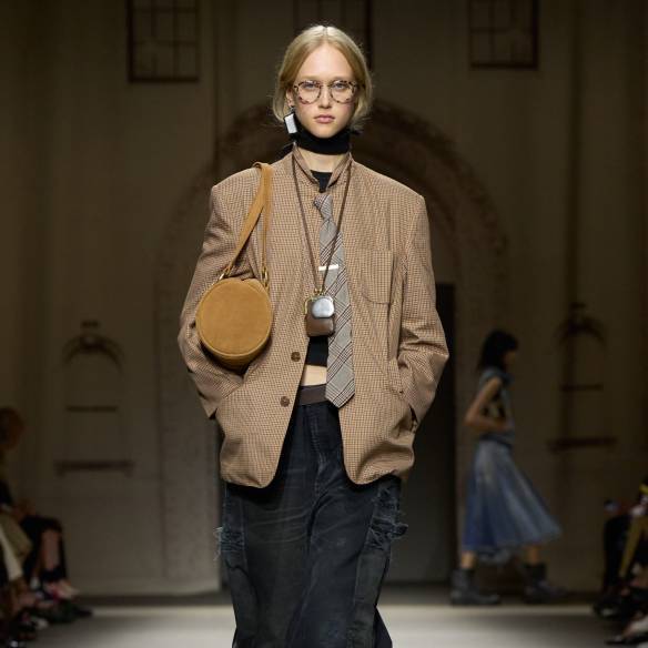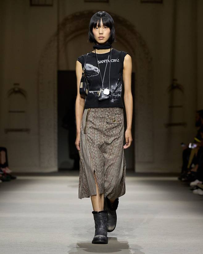 이번 컬렉션의 소재와 색감은 뉴욕이 던져주는 사소한 발견들에서 출발합니다. 인도에 버려진 카드, 전봇대에 붙은 스티커 같은 흔적들은 낡았지만 특별한 기억을 품은 도시의 단면을 상징합니다. 이러한 이미지는 패브릭 위로 옮겨져, 은은하게 바랜 듯한 톤과 광택으로 표현되었습니다. 스웨이드와 가죽은 표면의 질감을 그대로 드러나도록 가공해 시간의 흐름이 만든 깊이를 담았고, 메탈릭 디테일은 새것의 번쩍임이 아니라 오래된 표면에 깃든 빛을 그려냈습니다. 이 같은 시선은 액세서리에서도 이어졌습니다. 작은 봉투, 책, 로켓, 동전 모양의 펜던트는 도시 곳곳에서 발견되는 일상적 오브제를 그대로 옮겨온 듯한 모습으로 등장했죠.