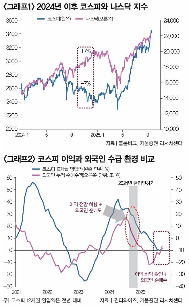 실제로 1995년(7월 시작, 총 75bp 인하, 연말까지 나스닥 +12%), 1998년(9월 시작, 총 50bp 인하, 연말까지 나스닥 +46%), 2019년(7월 시작, 총 75bp 인하, 연말까지 나스닥 +12%), 2024년(9월 시작, 총 75bp 인하, 연말까지 +7.0%) 금리인하기에는 주식시장이 상승했다. 물론 전 세계 경제 호황(1995), 닷컴버블 태동(1998), 미·중 무역 분쟁 해빙(2019), M7(엔비디아·애플·마이크로소프트·메타플랫폼스·아마존닷컴·알파벳·테슬라) 성장 독주(2024) 등 각 사례마다 고유 요인이 개입된 측면이 있긴 하지만, 연준의 금리인하가 경기침체 방지 차원의 보험성 금리인하로 인식되는 공통분모가 있다는 점에 주목해야 한다.따라서 주식시장 방향성은 연말까지도 위로 잡고 갈 필요가 있다. 일각에서는 한국 증시가 지난해 9~12월 연준 금리인하기 때와 마찬가지로 금리인하 수혜를 누리지 못할 것이라는 생각도 가질 법하다. 지난해 9월 말 연준의 금리인하 후 그해 연말까지 미국 나스닥은 7% 상승한 반면, 한국 코스피는 7% 하락한 경험이 있기 때문이다(그래프1 참조). 지난해에는 '코스피 이익 컨센서스 지속 하향+외국인 순매도+상법개정안 미통과' 조합이 한국 증시의 부진을 만들었다.