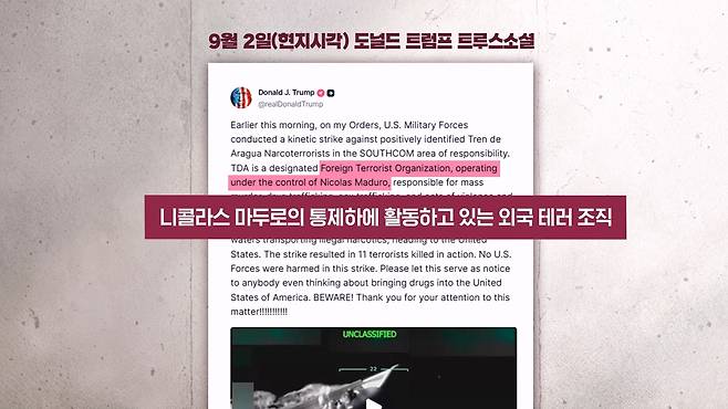 현지시각 9월 2일 트럼프 대통령의 트루스 소셜 메시지입니다. 첫 공습 때는 트렌 데 아라과라는 베네수엘라의 카르텔을 두고 이런 표현을 썼습니다. 마두로 대통령의 통제하에 활동하고 있는 외국 테러 조직이다라고 명시했는데요. 이외에도 실체에 대해선 의견이 분분하긴 하지만 미국 정부는 마두로 대통령이 이른바 '태양의 카르텔'과도 공모하고 있다고 주장하고 있습니다.