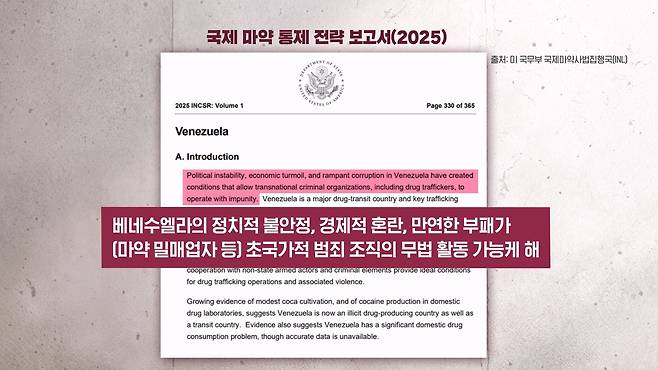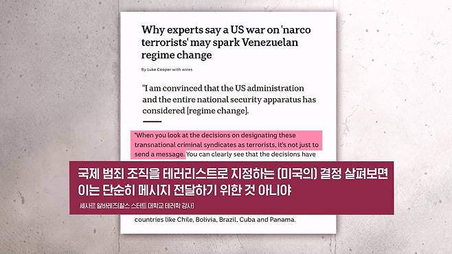 다만 일부 정보기관과 또 전문가들은 베네수엘라 정부가 해당 마약 조직을 직접 통제하지는 않는다 이렇게 평가를 하기도 했고요. 마약 유입 경로도 주로 콜롬비아 그리고 태평양 경로가 중심이 되지 베네수엘라가 중심은 아니다, 이런 지적도 나오고 있습니다.