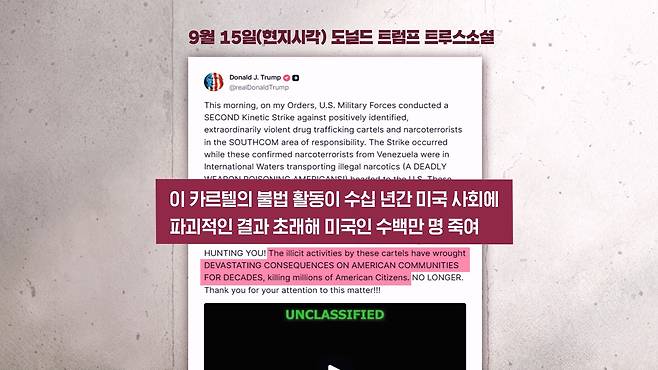 그리고 지난 15일 두 번째 공습 때는 이 카르텔의 불법 활동이 수십 년간 미국 사회에 파괴적인 결과를 초래해서 수백만 명의 미국인을 죽였다라고 하기도 했습니다.