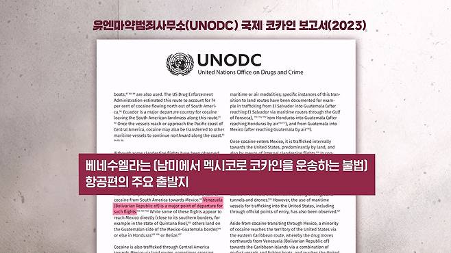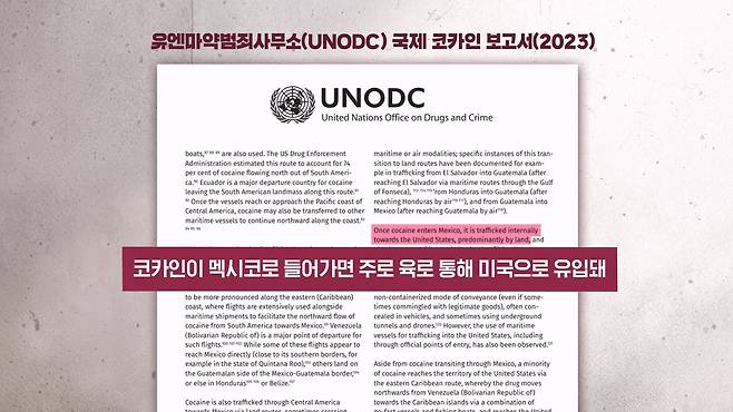 유엔마약범죄사무소(UNODC)는 2023년 보고서에서 베네수엘라를 남미에서 멕시코로 코카인을 운송하는 불법 항공편의 주요 출발지로 지목을 했습니다. 그리고 코카인이 멕시코로 들어가면 주로 육로를 통해서 미국으로 유입된다 이렇게 분석을 했습니다.