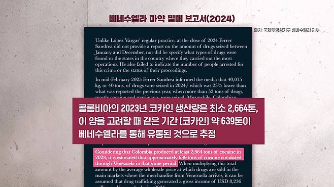 그리고 국제투명성기구 베네수엘라 지부는 2024년 보고서에서 콜롬비아의 2023년 코카인 생산량이 최소 2664톤으로 추정이 되는데 이 양을 고려할 때 같은 기간 약 639톤이 베네수엘라를 통해서 유통이 된 걸로 추정을 했습니다.