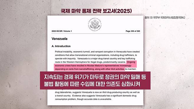 미 국무부는 올해 보고서에서 베네수엘라의 정치적 불안정 그리고 경제적인 혼란, 또 만연한 부패가 초국가적 범죄 조직에 무법 활동을 가능하게 했으며, 또 지속되는 경제 위기가 이 정권의 마약 밀매 등 불법 수입에 대한 의존도를 심화시켰다 이렇게 지적을 했습니다.