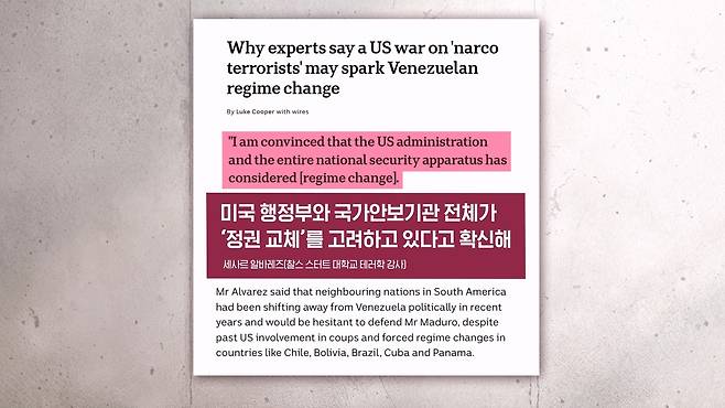 찰스 스터트 대학교에서 테러학을 가르치는 세사르 알바레즈는요. 트럼프 행정부의 테러리스트 지정 리스트를 살펴보면 이는 단순히 메시지 차원이 아니다. 정권 교체를 고려하고 있다고 자신은 확신한다 이렇게 말했습니다.