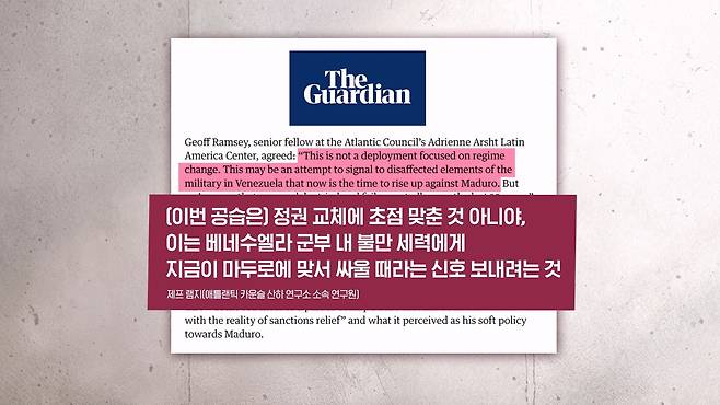 그리고 애틀랜틱 카운슬 산하의 한 연구소에 소속이 된 제프 램지라는 학자는요. 정권 교체에 초점을 맞췄다기보다는 베네수엘라 내부 불만 세력에 마두로에 맞서서 싸울 것을 촉구하는 신호를 보낸 것이다 이렇게 분석을 했습니다.