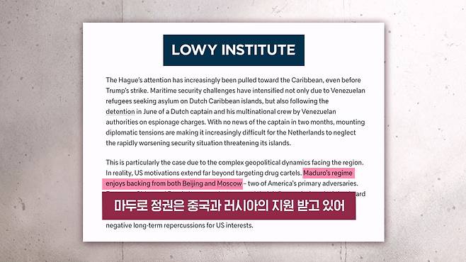 호주 로위 연구소의 한 보고서는요. 미국의 의도가 마약 카르텔을 표적 삼은 것 그 이상이라면서 마두로 정권에 대한 중국과 러시아의 지원을 견제하려는 다층적인 목적이 담겨 있다 이렇게 분석을 했습니다.