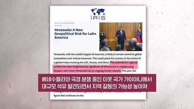 그리고 IRIS라는 연구소의 한 학자도 국경 분쟁 중인 가이아나에서 대규모 석유가 발견이 되면서 지역 갈등의 가능성이 더 높아졌다며 가이아나와 베네수엘라의 어떤 분쟁이 지역 안보의 불안을 증폭시키고 있다 이렇게 진단했습니다.
