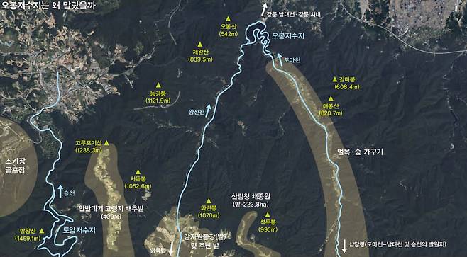 9월10일 함께 왕산천을 살펴보던 최병성 기후재난연구소 상임대표가 말했다. 왕산천은 오봉저수지로 물을 보내는 줄기 같은 하천이다. 태백산맥에서 동해안으로 내달리는 고루포기산(1238.3m), 서득봉(1052.6m), 화란봉(1070m), 석두봉(995m), 매봉산(820.7m), 갈미봉(608.4m) 등 산줄기가 머금고 있던 물을 소하천으로 내뿜고, 그 물줄기들이 만나 서남쪽 왕산천과 동남쪽 도마천을 이루고, 오봉저수지에서 합쳐진다. 전문가들이 오봉저수지의 배후 산지인 닭목령과 삽당령 등에 비가 얼마나 내렸는지를 해갈의 지표로 주목하는 까닭이다. 왕산천뿐만 아니라 도마천도 물이 요란한 소리를 내며 흐르고 있었다. 최 상임대표는 “가뭄 때문에 물이 말라버린 것이 아니라, 물은 꾸준히 흐르는데 양이 줄었다는 말이 정확할 것 같다”며 “아무래도 숲에 문제가 생긴 것 같다”고 지적했다.