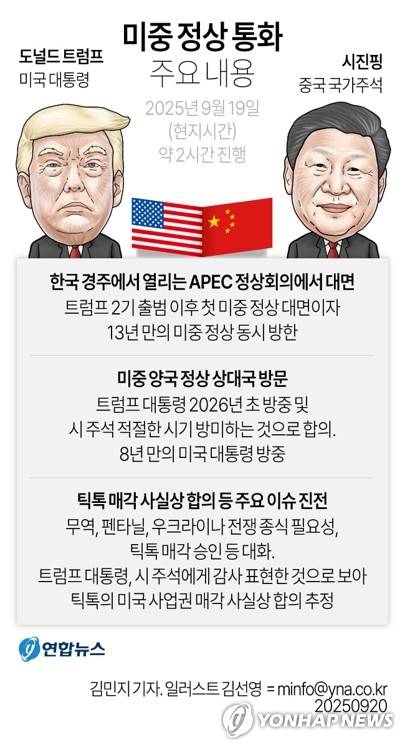 (서울=연합뉴스) 김민지 기자 = 트럼프 대통령은 19일(현지시간) 시 주석과의 전화 통화 이후 자신의 사회관계망서비스(SNS) 트루스 소셜에 글을 올려 "시 주석과 한국에서 열리는 APEC 정상회의에서 만나기로 합의했다"며 "양측 모두 APEC에서의 만남을 고대하고 있다"고 밝혔다.