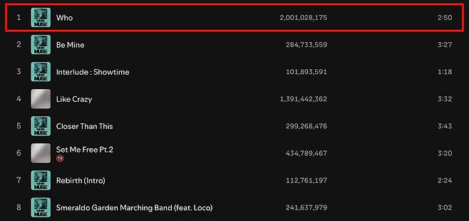 '후'로 20억 스트리밍을 기록했다.