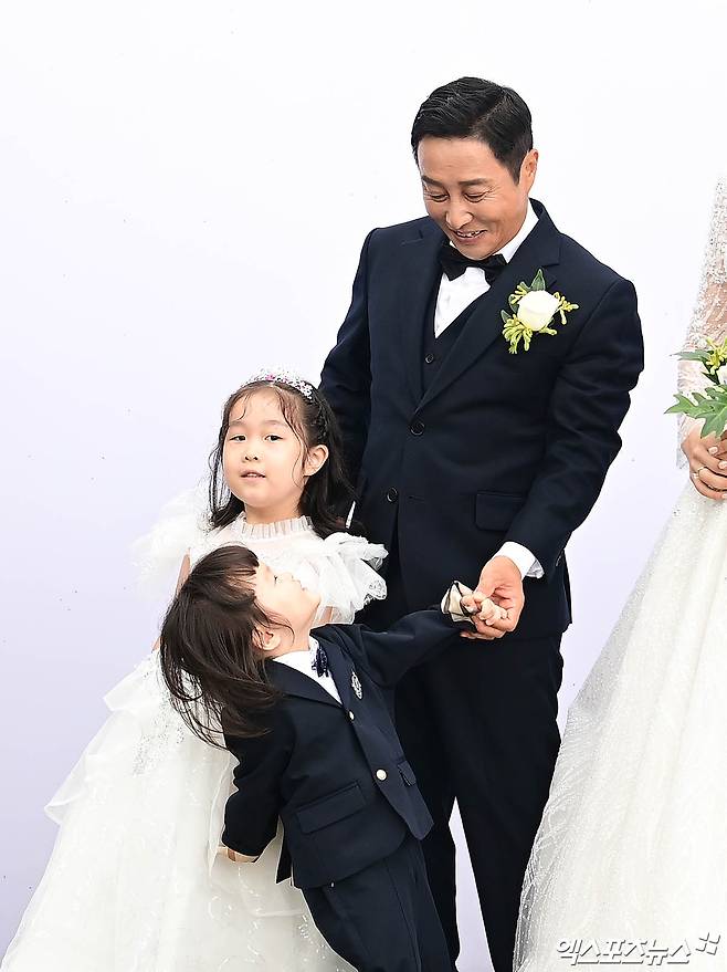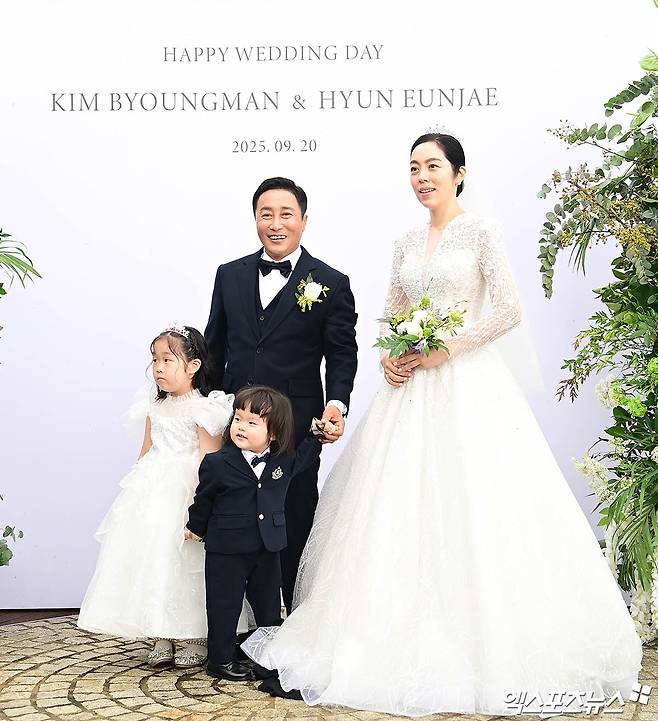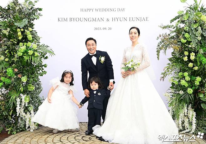결혼식에 앞서 김병만과 현 씨는 포토 타임을 진행, 새출발을 앞둔 설렘과 기쁨을 나눴다. 특히 이 자리에는 딸과 아들도 함께해 눈길을 끌었다.
