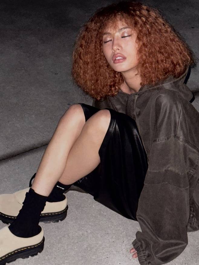 다른 사진에서는 가죽 스커트에 크롭 재킷을 입고 앉아있는 모습으로 힙한 매력을 더했다. 특히 생일 기념 사진에서는 회색 니트 투피스 차림에 풍성한 히피펌을 그대로 선보였다.