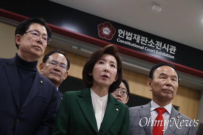 | ▲ 지난 3월 12일, 국민의힘 나경원, 이만희, 박덕흠, 임종득, 김장겸 의원 등 82명이 서울 종로구 헌법재판소에 윤석열 대통령 탄핵기각 2차 탄원서를 제출했다. 헌법재판소 민원실에 탄원서를 제출한 뒤 나경원 의원이 입장을 밝히고 있다. 사진 왼쪽에 보이는 사람이 이만희 의원. |