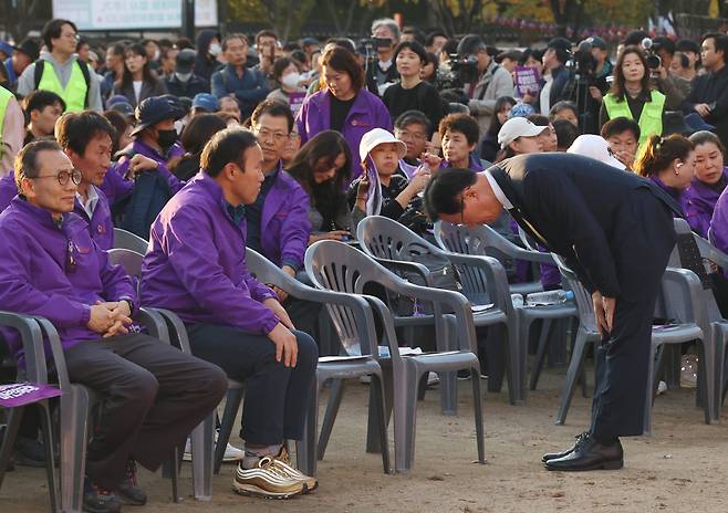 | ▲ 2023년 10월 29일, 이만희 국민의힘 당시 사무총장이 서울 중구 서울광장에서 열린 10·29 이태원 참사 1주기 시민추모대회에 참석해 유가족들에게 고개 숙여 인사하고 있다. |