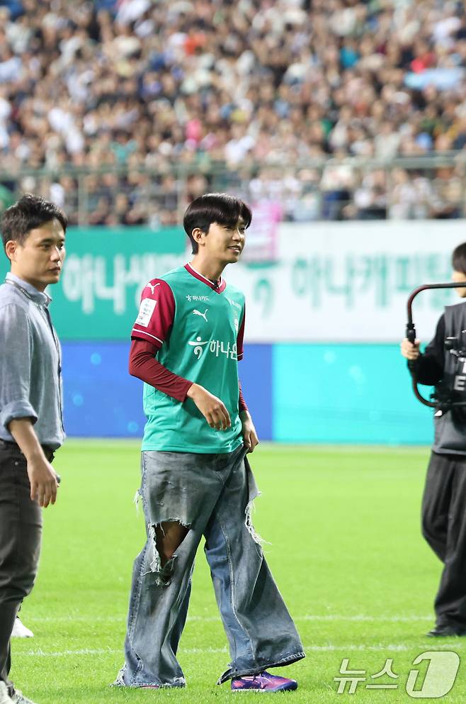 (대전=뉴스1) 권현진 기자 = 가수 임영웅이 20일 오후 대전월드컵경기장에서 열린 '하나은행 K리그1 2025' 대전하나시티즌과 대구FC 경기에 앞서 시축을 위해 이동하고 있다. 2025.9.20/뉴스1