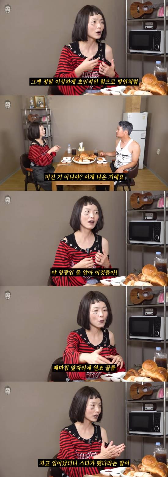 선배님들이 '영미야 됐다'했던데 한편으로는 걱정인 게 무대에서는 또 다르기 때문이었다. 그때 당시에는 여자가 과한 분장을 하고 나오면 '어~'하는 반응이 나왔다. 그러면 뒤에 뭘 해도 안 터진다. 혹시 무대에서 반응이 안 좋을 수 있겠다 각오하고 나갔는데 등장하자마자 터졌다. 때마침 앞자리에 '원조 골룸' 조혜련 선배님도 앉아계셨는데 박수를 쳐주셨다. 자고 일어났더니 스타가 됐다는 말을 그때 체감했다. 다음 날 회의를 하러 갔는데 작가님이 기자들한테 전화 오고 난리가 났다고 하더라. 깜짝 놀랐다"고 털어놨다.