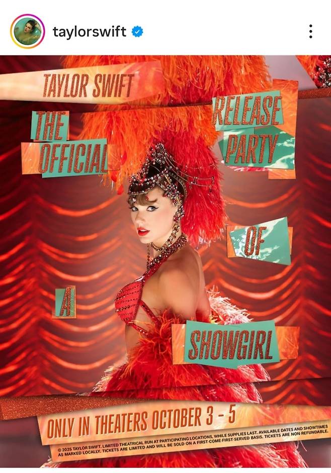 스위프트의 신작 영화 '쇼걸의 공식 릴리즈 파티'(Taylor Swift: The Official Release Party of a Showgir)가 오는 10월 3일~5일 극장 한정으로 개봉한다는 소식에 힘입은 것이다.