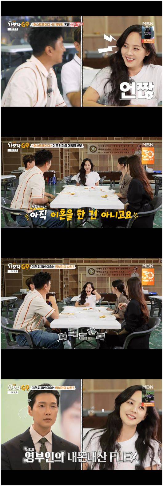 안정환은 “아니, 이혼하신다면서요?”라며 유진에게 장난스럽게 물었다. 유진은 “아직 이혼한 건 아니고요, 위혼 위기에 있습니다”라고 말했다. 안정환은 “이야기를 들어보니까 대통령 당선까지 시켰는데 솔직히 대통령이 이혼하자고 하는 건 좀 아닌 거 아니냐”라며 의아해했다.