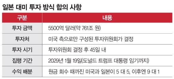 한국은 7월 30일 미국과 타결한 관세 협상에서 미국이 한국에 부과하는 상호관세를 25%에서 15%로 낮추는 대신, 3500억 달러 규모의 대미 투자 등을 약속했다. 이후 진행된 세부 협상에서는 이견이 계속되는 상황이다. 하워드 러트닉 미국 상무장관은 9월 11일 "한국이 일본 모델을 수용하지 않으면 25% 관세를 내야 한다"고 공개 압박에 나섰다.일본은 9월 4일 미국과의 무역 합의를 공식 이행하는 행정명령에 서명했다. 일본은 도널드 트럼프 대통령 임기 내 일본 금융기관이 5500억 달러(약 761조 원) 투자금을 미국 정부 결정에 따라 투자하고 45일 내 자금을 이체해야 한다(표 참조). 수익도 원금 회수 때까지 절반으로 나누다가 이후에는 미국이 수익의 90%를 갖는다. 사실상 미국 측이 일본으로부터 투자 백지수표를 받아낸 셈이다. 김태황 명지대 국제통상학과 교수는 "일본이 미국의 불합리한 요구를 수용한 점이 이해되지는 않지만, 자동차 관세에서 한국보다 하루빨리 우위를 점하는 편이 나을 것이라는 계산이거나, 한국이 좋은 협상 조건을 얻어내면 재협상을 시도하려는 의도"라고 설명했다.