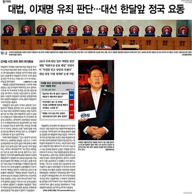 전원합의체 판결 직후 조희대 대법원장 사퇴 및 탄핵소추론이 쏟아졌습니다. 그러나 서울고법이 파기환송심을 대선 뒤로 미뤘다가 대선 뒤에는 아예 재판을 중단하면서 조희대 대법원장 사퇴론은 잦아들었습니다.