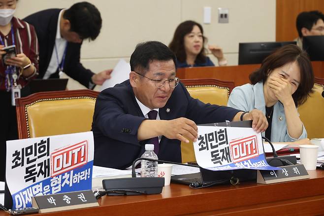 | ▲ 이상휘 국민의힘 의원이 7월 14일 오후 국회 과학기술정보통신위원회 전체회의에서 '최민희 독재OUT', '이재명은 협치하라’는 피켓을 붙이고 있다. |
