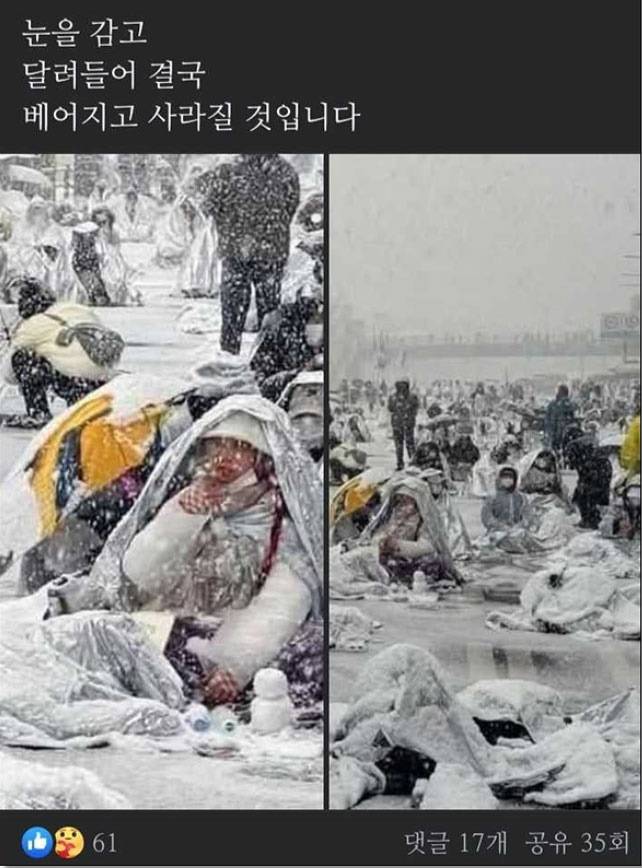 사진에는 아스팔트 위에서 눈을 맞고 있는 시민들의 모습이 담겨 있었다. 윤석열 관저 앞에서 '윤석열 즉각퇴진'을 요구하는 시민들이 눈이 내리는 와중에 은박지를 몸에 두르고 밤새 자리를 지켜 화제가 됐던 바로 그 '인간 키세스' 사진이다. 해당 사진 왼편에는 본래 정혜경 진보당 의원도 담겨 있었으나 그 부분이 잘린 채 페이스북에 올라갔던 것이다.