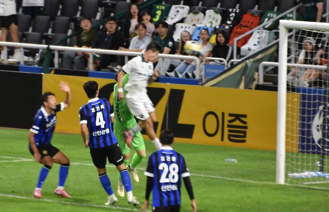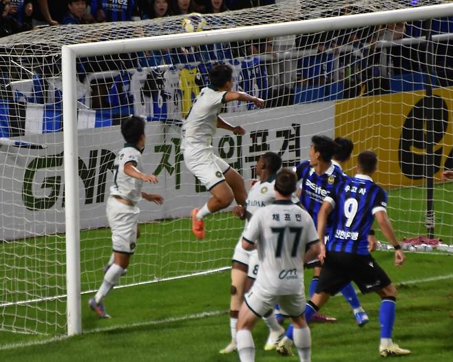 | ▲ 85분 16초, 인천 유나이티드 FC 무고사(맨 오른쪽 9번)의 헤더 골이 김포 FC 골문 상단에 들어간 순간 |