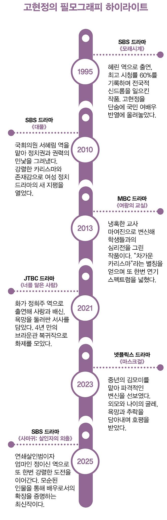 고현정은 한국 드라마 역사에서 상징적인 이름이다. 1990년대 《모래시계》로 국민적 신드롬을 일으키며 '국민 여배우'로 자리매김했고, 이후 긴 공백 끝에 돌아온 2000년대에는 《여왕의 교실》 《대물》 등으로 강렬한 카리스마와 시대를 읽는 연기를 선보였다. 단순한 미모의 상징을 넘어 사회적 메시지를 담은 드라마의 얼굴이 된 것이다.