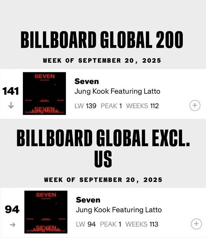 ‘Seven’은 같은 날 발표된 ‘글로벌(미국 제외)’ 차트에서도 94위를 차지하며 무려 113주 연속 랭크에 성공했다. 두 차트를 동시에 뚫고 최장 진입 기록을 이어가는 아시아 솔로는 정국이 유일하다.