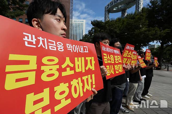[서울=뉴시스] 김명원 기자 = 금융감독원 직원들이 21일 오전 서울 종로구 서린동 영풍빌딩 남측에서 금융감독원 조직 개편 반대 집회를 하고 있다. 금융소비자보호원(금소원) 분리, 신설되고 금융시장감독 기능도 일부 축소될 가능성이 높은 금감원은 직원들이 일방적인 조직개편을 규탄하며 총파업까지 검토하고 있는 비상대책위원회를 구성한 금감원 직원들은 민주당이 단독으로 정부조직법 개정안을 통과시키면 장외 투쟁 강도를 더욱 높인다는 방침이다. 2025.09.21. kmx1105@newsis.com