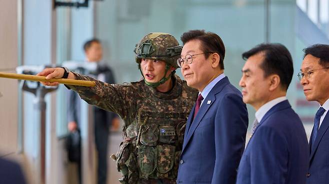 ▲ 이재명 대통령이 지난 12일 강원도 화천 7사단에서 군 관계자의 설명을 듣고 있다.
