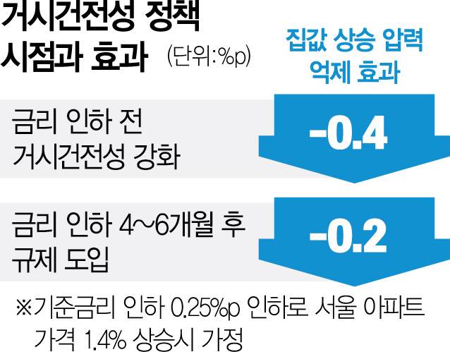 한은은 21일 발표한 ‘거시 건전성 정책의 파급 영향 분석 및 통화정책과의 효과적인 조합’ BOK 이슈노트에서 기준금리를 0.25%포인트 인하할 경우 서울 아파트 값이 1년 평균 1.4%의 상승 압력을 받는다고 분석했다. 다만 금리 인하 이전에 대출 규제 등 거시 건전성 조치를 강화하면 상승 압력을 0.4%포인트 줄일 수 있는 것으로 나타났다. 반대로 금리 인하 4~6개월 뒤에 규제를 시행하면 인하 효과가 0.2~0.3%포인트에 그쳐 절반 수준으로 떨어지는 것으로 드러났다.
