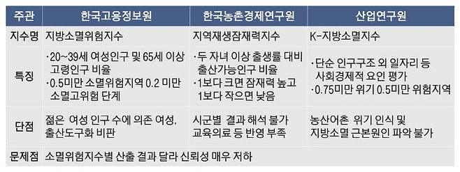 한국농촌경제연구원의 '지역재생잠재력지수'도 있다. 각 지역이 앞으로 인구를 얼마나 늘릴 수 있는지 잠재력을 평가하는 통계 지수다. 지역의 전반적인 출산 분위기 파악에는 유효하나 지역사회의 생활 인프라나 교육·의료 접근성 등의 복지 문제를 질적으로 판단하기 어렵다는 지적을 받는다. 또 산업연구원의 'K지방소멸지수'는 단순 인구구조 외에 지역경제 일자리 등 사회경제적 요인을 평가해 지방 소멸 위험성을 입체적으로 분석한다는 장점이 있다. 다만 지방 소멸의 근본적 원인인 청년 유출·수도권 일자리 편중 등의 파악이 어렵다는 단점도 존재한다. 결국 세 지수 모두 각각 한계점이 뚜렷해 제대로 된 '지방 소멸 위험' 분석이 어려운 현실이다.