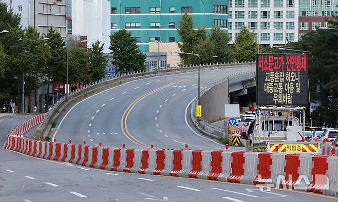 [서울=뉴시스] 황준선 기자 = 21일 서울 중구 서소문 고가차도의 차량 통행이 전면 통제되고 있다.