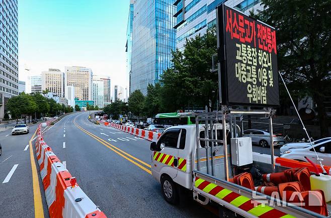 [서울=뉴시스] 황준선 기자 = 21일 서울 중구 서소문 고가차도의 차량 통행이 전면 통제되고 있다.