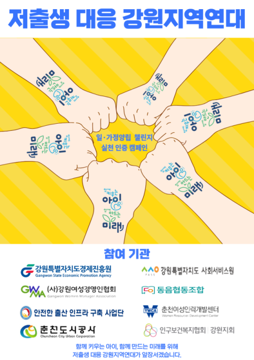 저출생 문제 해결과 가족친화적 지역 문화 확산을 위해 마련된 이번 캠페인에 도사회서비스원, 동음협동조합, 안전한 출산 인프라 구축 사업단, (사)강원여성경영인협회, 춘천여성인력개발센터, 춘천도시공사 등이 참여했다.