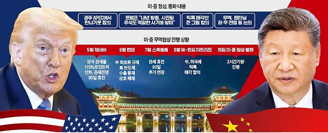 미·중 정상이 경주 아시아태평양경제협력체(APEC) 정상회의에서 만나기로 하면서 미·중 갈등이 누그러질 것이란 기대가 커지고 있다. 중국이 동영상 플랫폼 틱톡의 미국 사업권을 미국에 넘기기로 큰 틀에서 합의한 게 계기가 됐다. 하지만 틱톡 매각을 두고 양측이 미묘한 시각차를 드러낸 데다 관세 전쟁, 펜타닐(합성마약) 등 현안이 산적해 ‘불안한 해빙’이란 평가가 지배적이다.