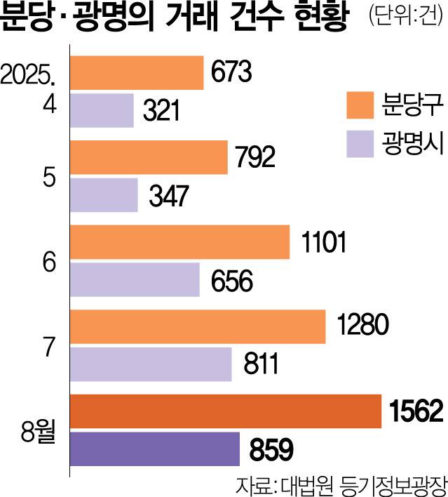 21일 대법원 등기정보광장에 공개된 집합건물(아파트·연립·오피스텔 등) 소유권 매매 이전등기 통계를 분석한 결과, 분당구의 매수 건은 5월 792건에서 8월 1562건으로, 광명시는 347건에서 859건으로 각각 1.97배, 2.48배 늘었다. 집합건물은 아파트·구분상가·다세대 등이 포함되지만 거래량의 절대다수는 아파트다. 서울의 매매 건수가 6월 2만 871건으로 정점을 찍고 7월 1만 8214건, 8월 1만 6868건으로 줄어드는 점을 고려하면 서울 아파트 매수세가 이들 지역으로 이동했다는 분석이 나온다.